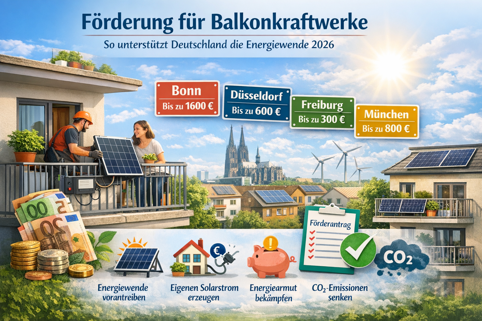 Um die Balkon-Solaranlage zu installieren, benötigst du ein PV-Modul (Solarpanel), ein Wechselrichter, eine Halterung für das Modul und entweder ein Schuko- oder Wielandkabel. Es ist auch ratsam, ein Strommessgerät hinzuzufügen, um die Leistung besser zu überwachen.Das Solarpanel wird mit der Halterung so positioniert, dass es die maximale Sonnenstrahlung aufnehmen kann. Der Wechselrichter wird mit dem Panel verbunden, um den erzeugten Solarstrom umzuwandeln. Dadurch wird der Strom in das normale Hausstromnetz eingespeist.Um die Verbindung zwischen dem Hausnetz und der Solaranlage herzustellen, benötigst du einen Schukostecker. Dieser kann in eine herkömmliche Haushaltssteckdose gesteckt werden, und er ermöglicht, dass der erzeugte Solarstrom automatisch von deinen Haushaltsgeräten genutzt wird. Dies führt zur Reduzierung von Co2 Ausstoß und senkt langfristig deine Energiekosten.